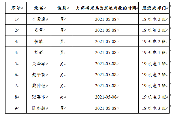 经过班级推荐,现有以下同学拟定为2021年上半年党员发展对象,特公示如下,公示时间为5月10日至5月15日。公示期间为,如有异议,请反映至机电工程学院学院办公室,电话:8362266,机电工程学院学工党支部:15073888817。