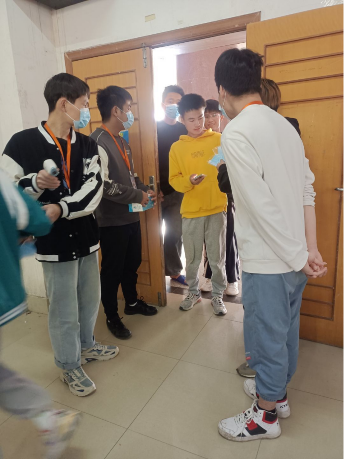(同学们依次戴好口罩测量体温有序进场)