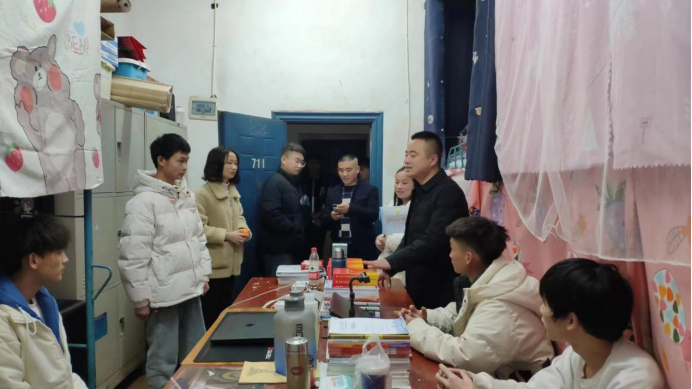为了全时段全方位保证校园的秩序和安全,机电学院柴院长于2023年2月12日带诸多辅导员深入到每个年级各个班级的寝室中去,通过与同学聊天交流,了解同学们在学习生活中遇到的问题和困难,为他们提供力所能及的帮助,切实解决在校学生思想、住宿、餐食和学习等问题,打造了师生共同营造安全校园的强劲引擎。
