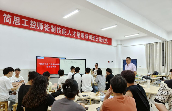 娄底市简思工控有限公司是一家集研发、生产、销售和服务于一体,以工农业可编程自动化控制为核心的新型可编程控制企业,具有典型的智能化特征,与“楚怡”双高专业群—机电一体化技术专业群培养目标相适配。本次培训班主要从案例入手,对简思中文指令编程方式及控制原理有一个初步认识,了解如何从流程图入手编写程序并快速应用于实际案例中。引导学生认识到各种实际应用场景的编程及参与现场调试。企业提供各类案例的模型装置,让学生有机会去进行实操和验证。还有一些涉及到的专业内容,如流水灯、自动攻丝、数控机床、模拟量采集与控制、变频器的控制、运动控制、人机界面编程、物联网关模块、上位机操作及其机器视觉等等。