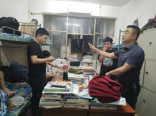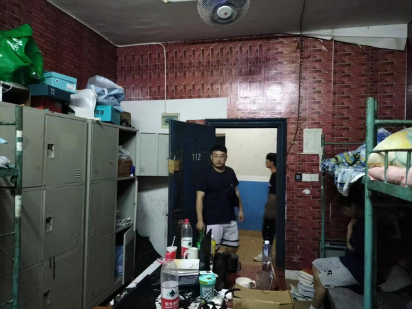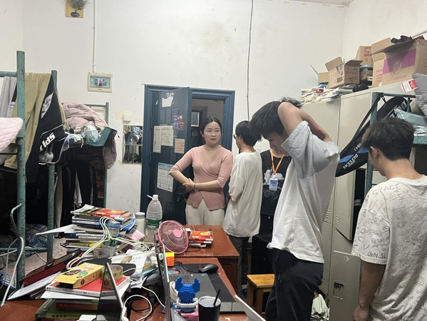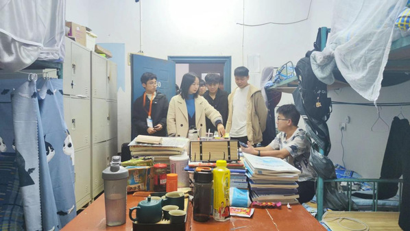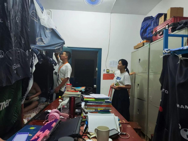 (彭鑫老师在检查学生寝室)