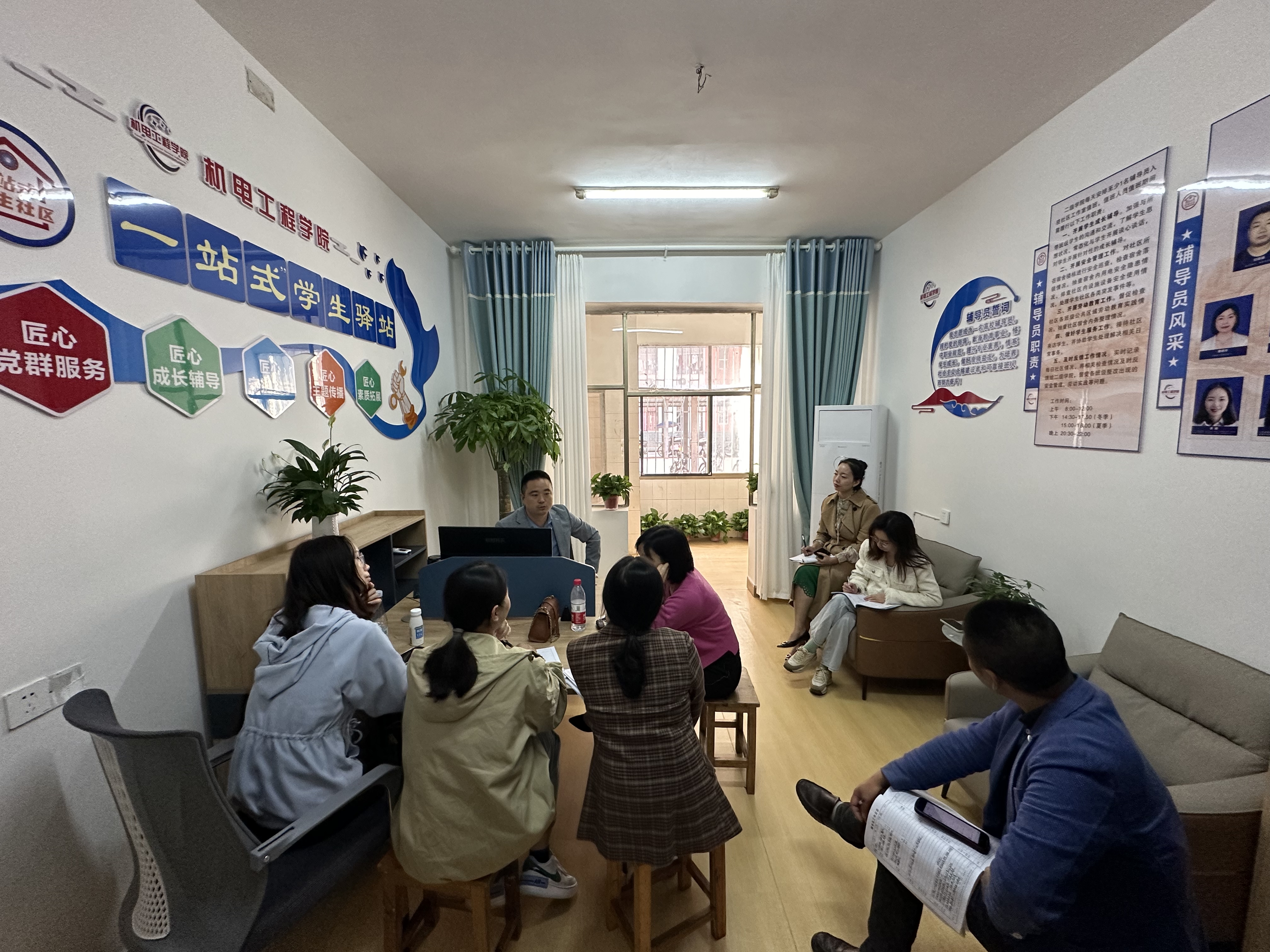 10月20日,机电工程学院辅导员工作例会在学生公寓6栋“一站式”学生驿站召开,标志着机电工程学院思政管理人员正式下沉社区。会议上,副院长柴斌就如何开展匠心党群服务、匠心成长辅导、匠心守护安宁、匠心主题传播、匠心素质拓展进行了安排部署。
