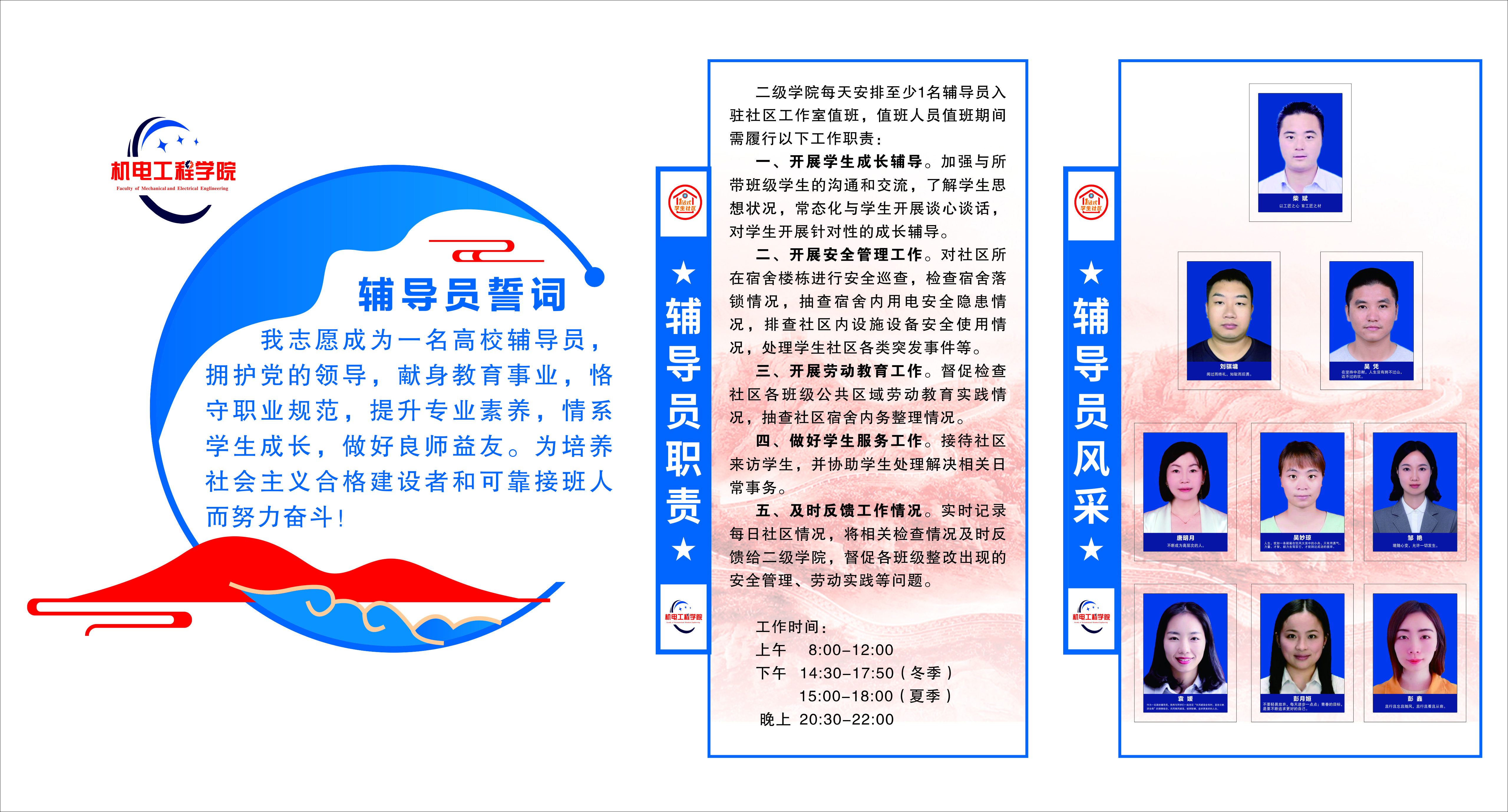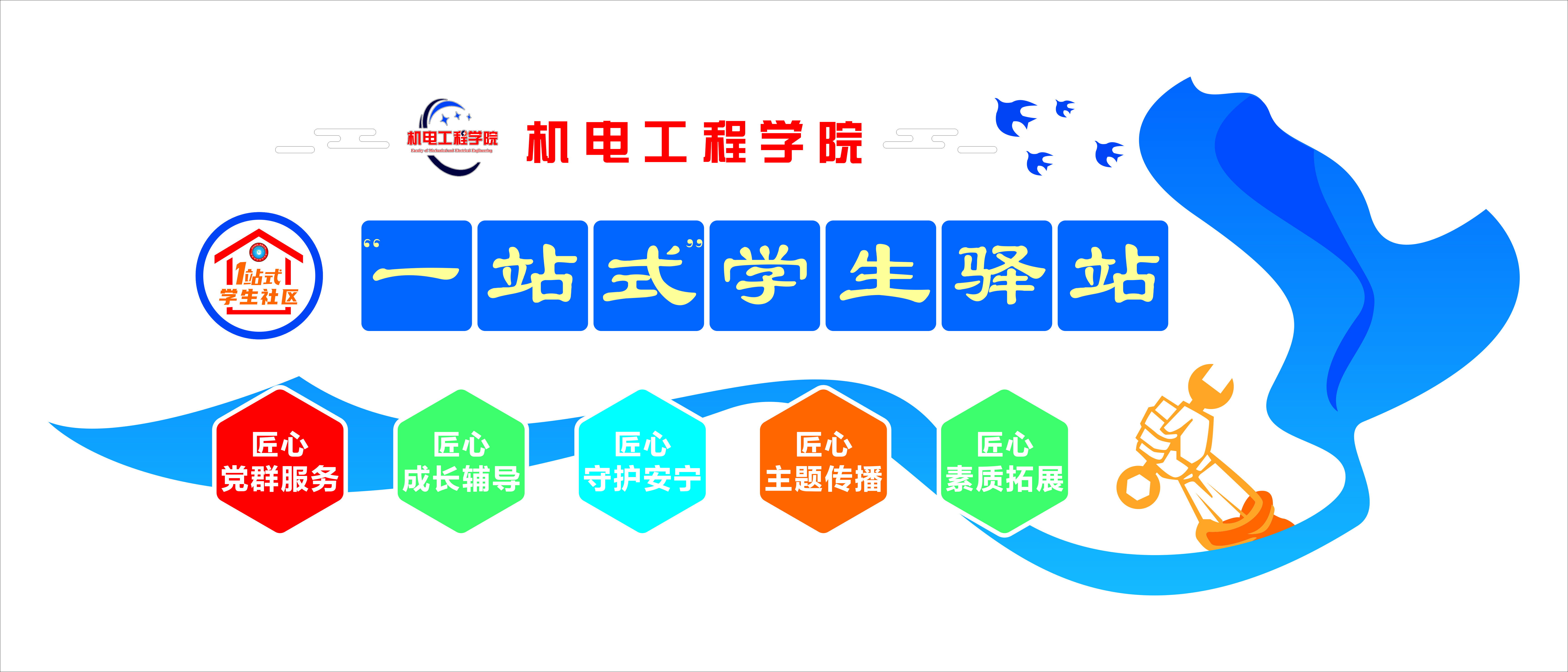 机电工程学院“一站式”学生驿站以“德技并修、匠心育人”为主题成果展,共分为,匠心育人篇、匠心共育篇、匠心成才篇三个部分,以学生全面成长为中心,坚持“三全育人”,突出“五育并举”;以执着专注、精益求精、一丝不苟、追求卓越的匠心精神,用心优化学生办事流程,尽心拓展学生服务内容,切实发挥机电工程学院“一站式”学生驿站的功能,努力将“一站式”学生驿站建设成为机电学子的成长共同体、资源汇集地、温暖避风港、交流互助园、信仰加油站、创新创意田。
