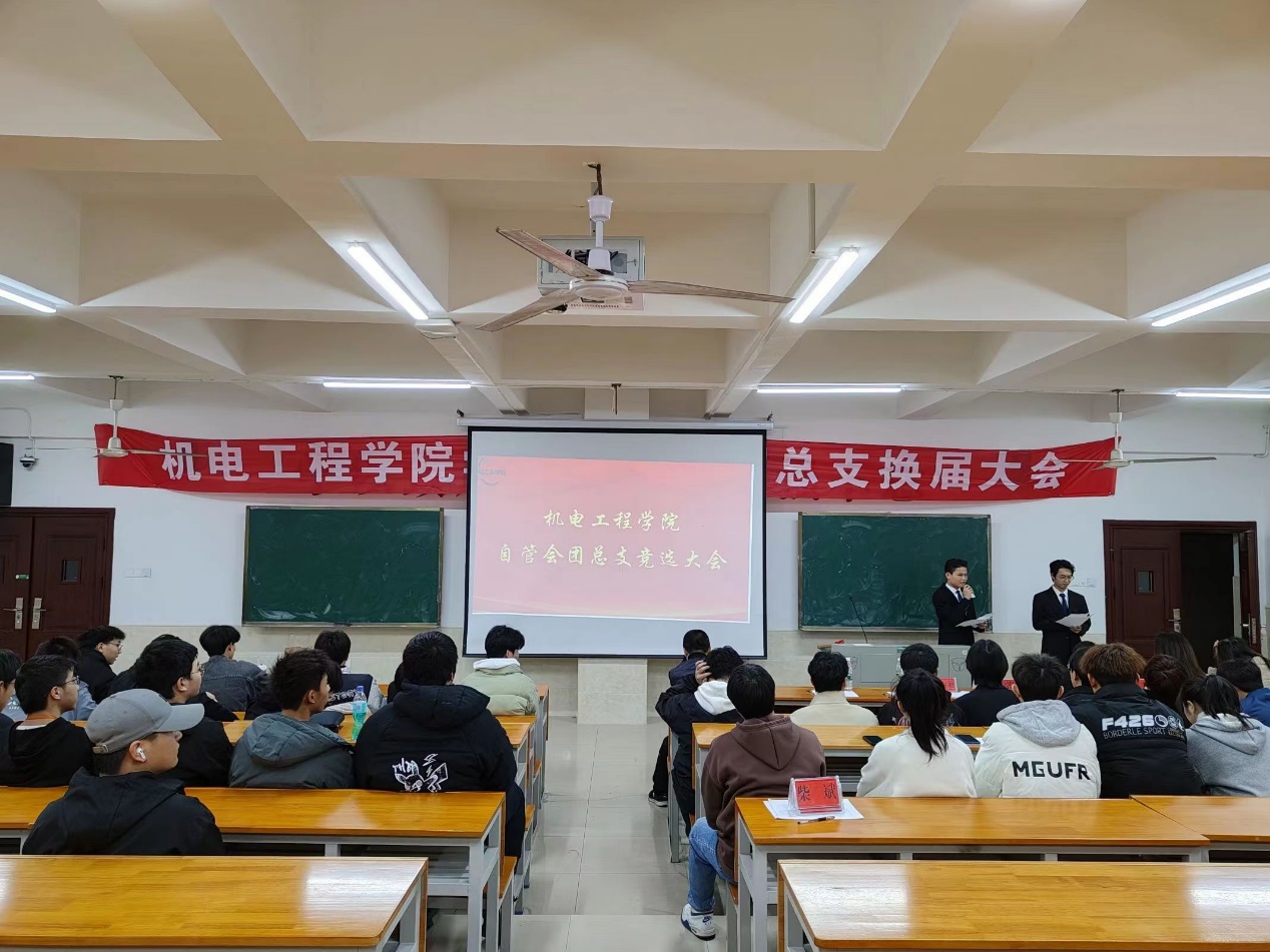 机电工程学院于12月4日晚,在主教楼进行自管会团总支换届大会,参与人员有刘骐墉老师、孙锦涛老师、汤伟杰老师、吴凭老师、彭鑫老师、邹艳老师、袁媛老师及全体自管会全体人员,大会由自管会团总支主席谢鑫、团总支副书记庹榛主持。