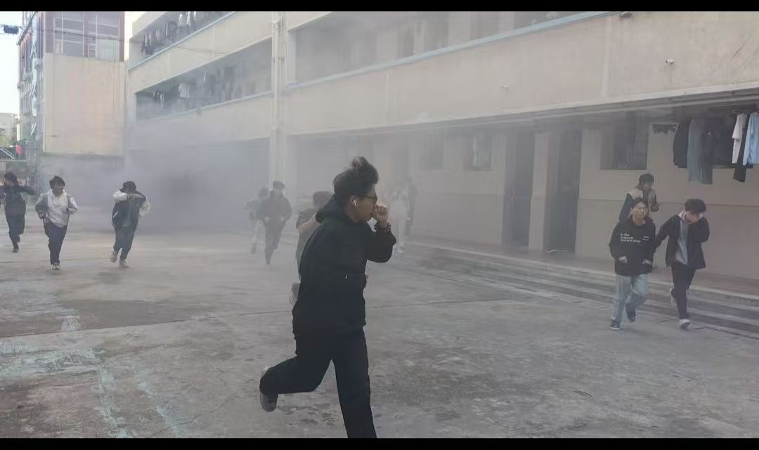 同学们接到疏散指令后,用湿毛巾捂口鼻,低姿快速撤离到指定地点。