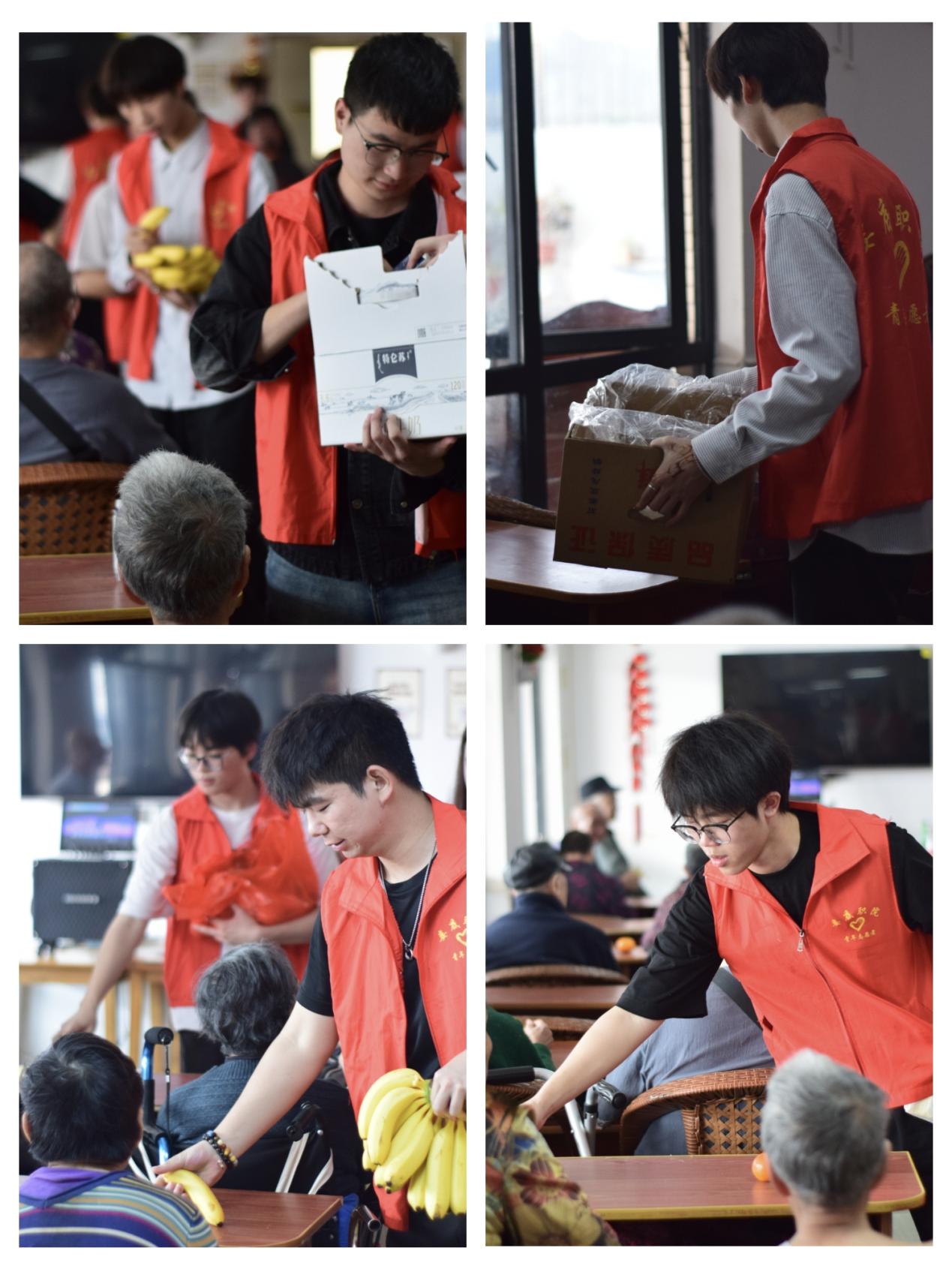 志愿者们给老人们分发准备好的牛奶,水果等物品。