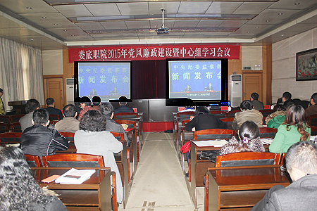 4月9日,我院在主教学楼多功能报告厅举行2015年党风廉政建设暨中心组学习会议,在家的全体院领导、全院副科实职以上干部与会。