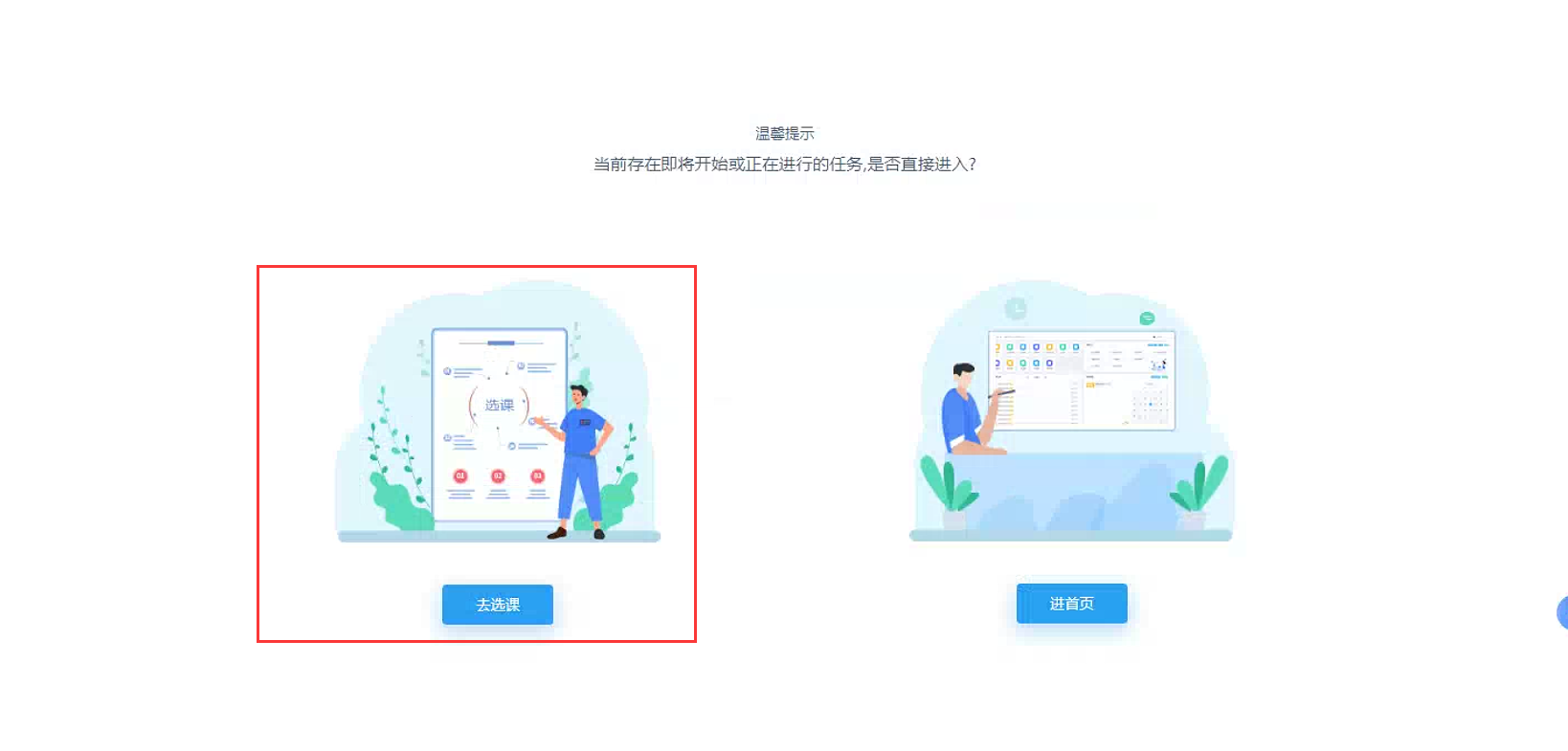 在选课时间内,系统会如图2进行提示:当前存在即将开始或正在进行的任务,是否直接进入? 点击进入“去选课”后,在选定的公选课后面点击“选课”(如图3)。