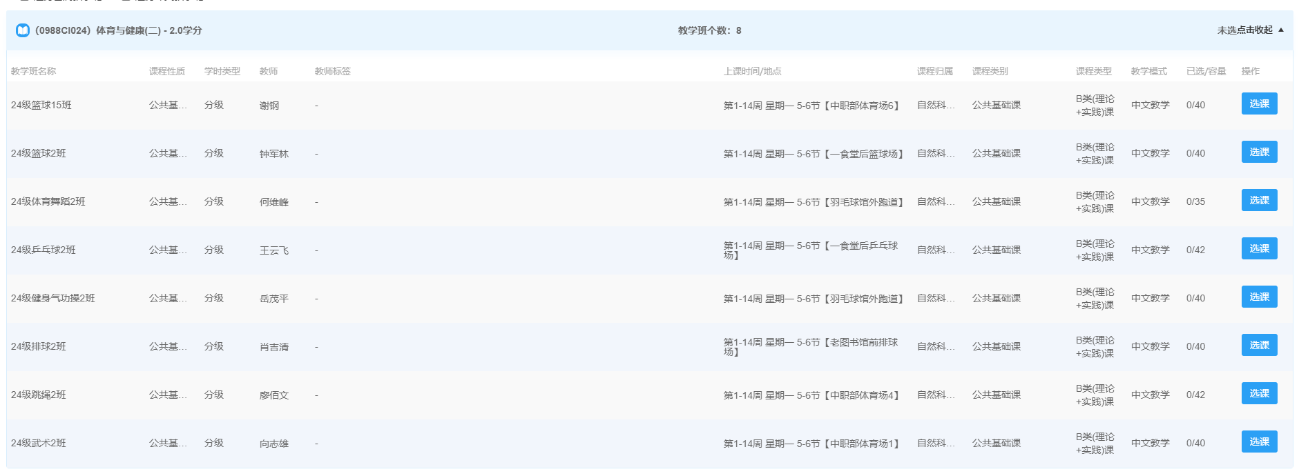 综合校区2025级三年制大专各班学生进入教务管理系统后,可自行查看本班体育课开设时间段内,各兴趣分项及授课教师。
