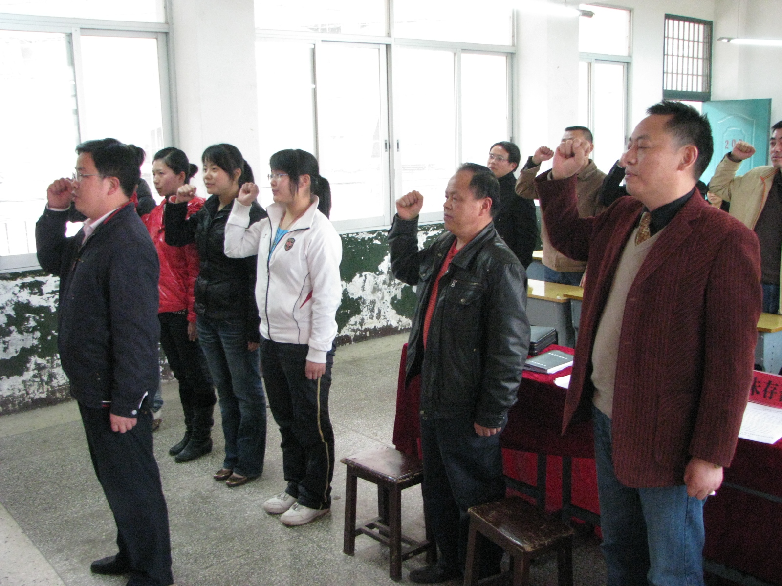 支部组织委员李甄同志宣读了院党委关于接收继续教育科研评建党支部中共预备党员的批复。四名新党员面向党旗起立,举起右手,由支部宣传委员胡拥军同志领誓,郑重地宣读自己的誓言,向党表明自己的目标与决心。与此同时,支部其他党员也全体起立,举起右手,重温誓词,再次向党表决心。