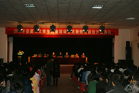 11月9日下午,2011年娄底市大学生创业培训娄底职院培训班开班典礼在南苑礼堂举行。娄底团市委副书记周庶舟,市人社局职业能力建设科科长戴邵新,市财政局社保科副科长曾宏,团市委宣传部长邓娟,我院院长杜祥培,副院长周意坚,继续教育部主任刘罗仁,招就处处长朱存斋,院团委书记欧芳及500名09级学生参加了开班典礼。典礼由周意坚主持。