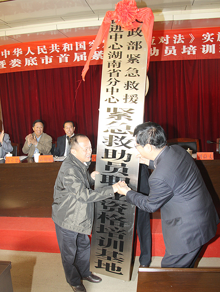 民政部紧急救援促进中心湖南省分中心主任罗靖兮向我院授予“民政部紧急救援促进中心湖南分中心紧急救助员职业资格培训基地”牌匾,副院长周意坚代表学院接过牌匾。