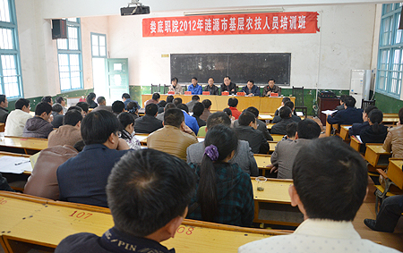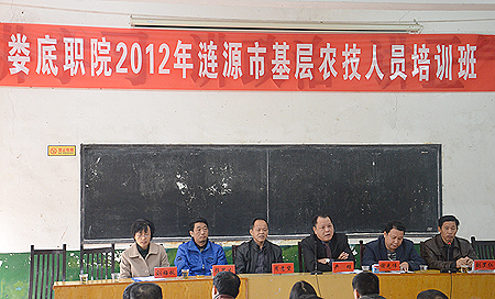 农业发展的根本出路在于科技进步,基层农技推广人员是科教兴农的基层骨干力量。为了切实提高基层农技员业务素质、技能水平和服务能力,增强科技对农业、农村经济发展的支撑能力,全面推进农业科技入户,为促进农民持续增收提供有效服务和技术支撑,按照《农业部办公厅、财政部办公厅关于印发<2012年基层农技推广体系改革与建设实施指导意见>的通知》和《湖南省2012基层农技推广补助项目实施方案》的通知要求,娄底市由市农业局农技推广站牵头,会同涟源、新化、冷江、双峰、娄星区农业局,围绕五县市主导产业,结合实际情况开办基层农技员培训工作,由我院承办。11月11日,涟源市基层农技员培训班在涟源市党校开班。我院党委委员、副院长周意坚、涟源市农业局党组书记、局长严雄,娄底市农业局科教科科长谢光伟、涟源市农业局副局长颜罗生,我院继续教育部主任刘罗仁、农林系主任刘梅秋出席,继续教育部副主任李甄、邓喜培,涟源农业局科教站站长黄世祥、培训班全体学员参加了仪式。仪式由刘罗仁主持。