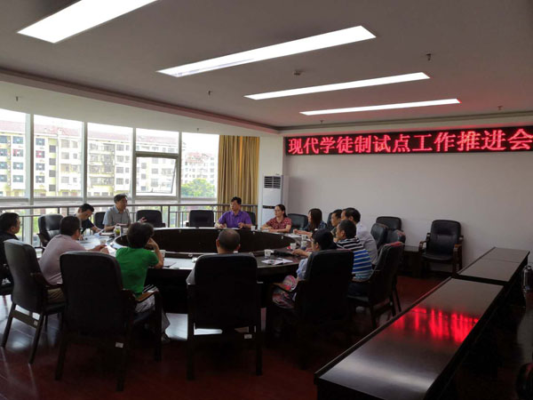 6月14日,我校在综合楼会议室召开现代学徒制试点工作推进会。校长朱忠义、副校长龙伟出席会议并讲话,教务处、人事处、招就处、财务处负责人、国家级、省级、校级现代学徒制试点项目负责人和试点项目所在二级学院院长参加会议。教务处处长游新娥主持会议。