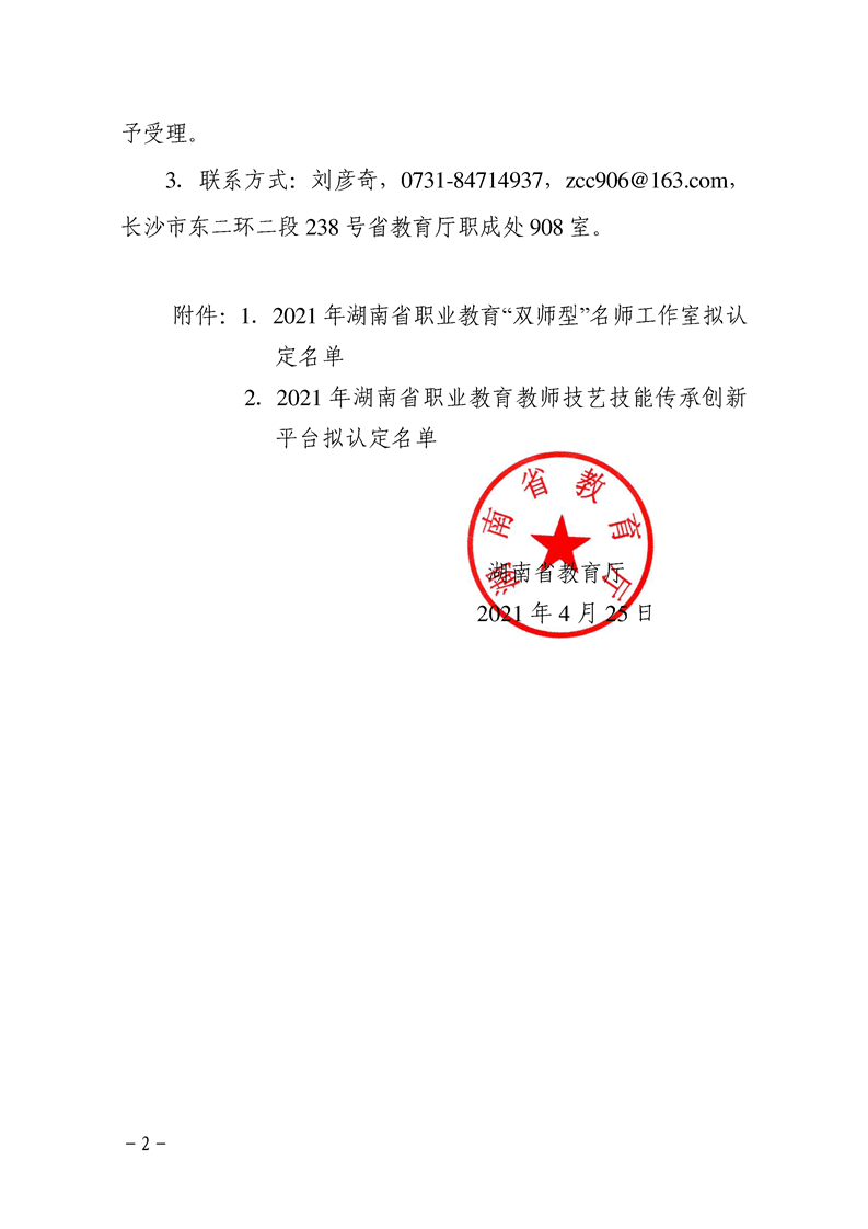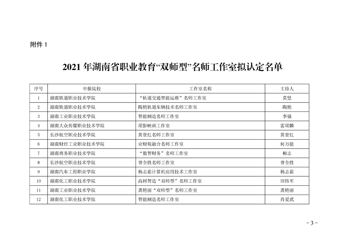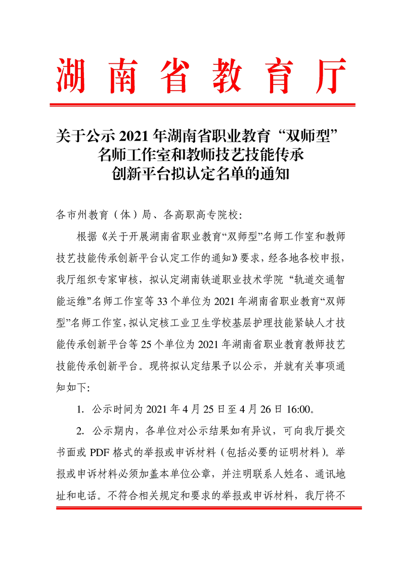 关于公示2021年湖南省职业教育“双师型”名师工作室和教师技艺技能传承创新平台拟认定名单的通知