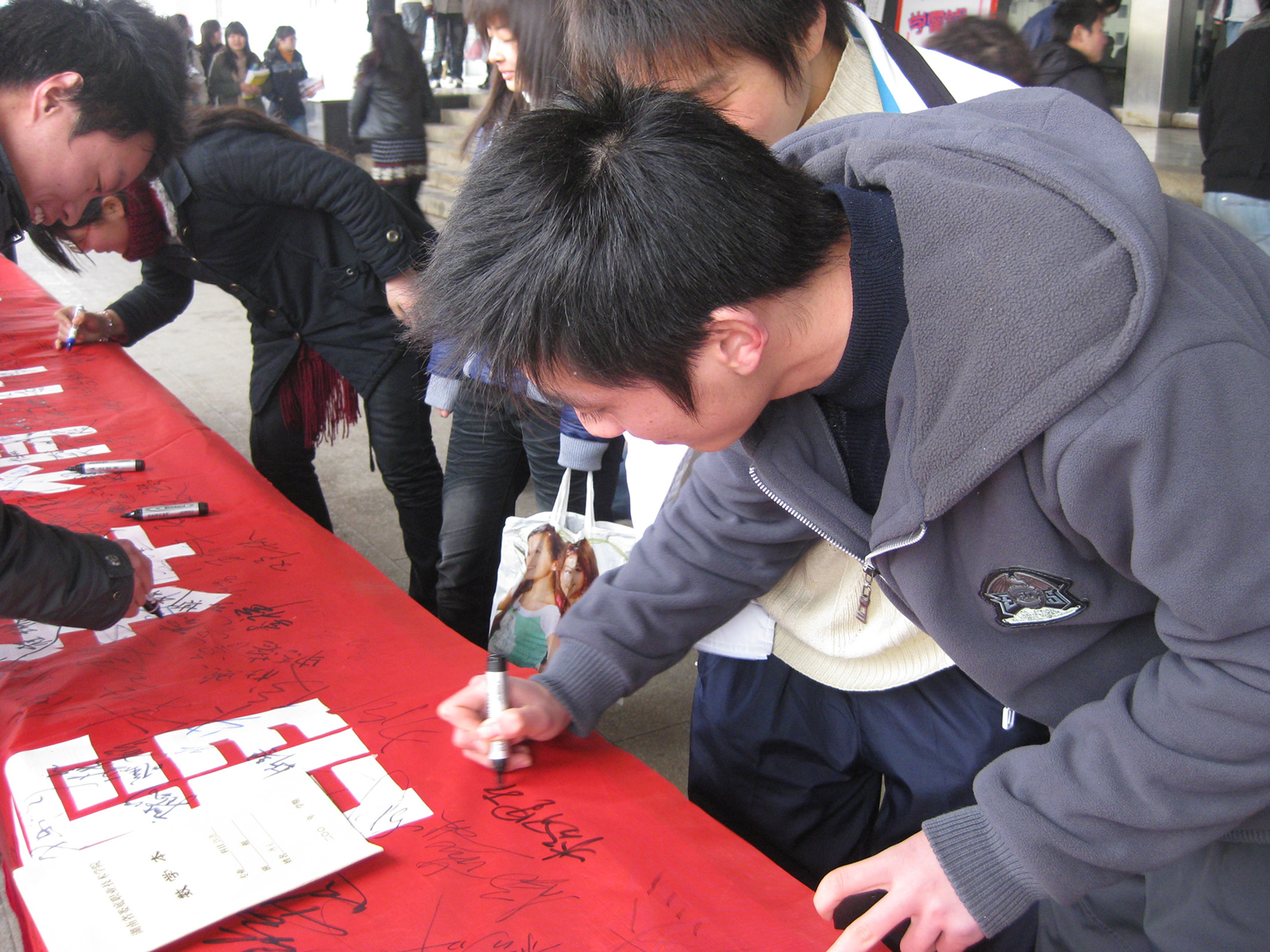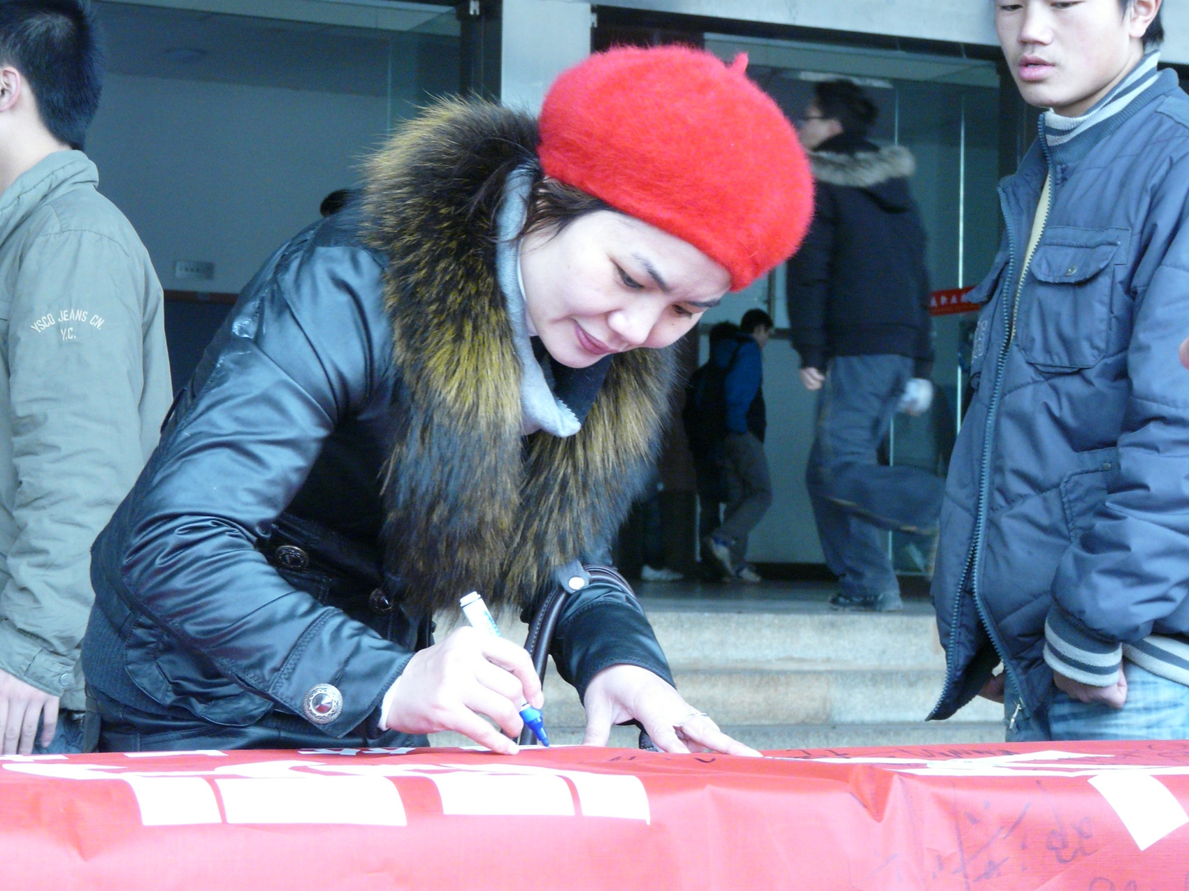 3月5号,在系部的领导下,在系学生会的组织下,我系在主教学楼门口举行了“学习雷锋精神,争做文明大学生”的主题签名活动。活动现场,同学们一个个争先恐后,抢着签名!同时,我系学工主任曾素纯和其他一些老师也纷纷来到现场和同学们一起参加了这次活动。在这里,他们不仅仅是在横幅上写上了他们的名字这么简单,而更多的是表达了他们内心那份“学习雷锋精神,争做雷锋好榜样”的决心!