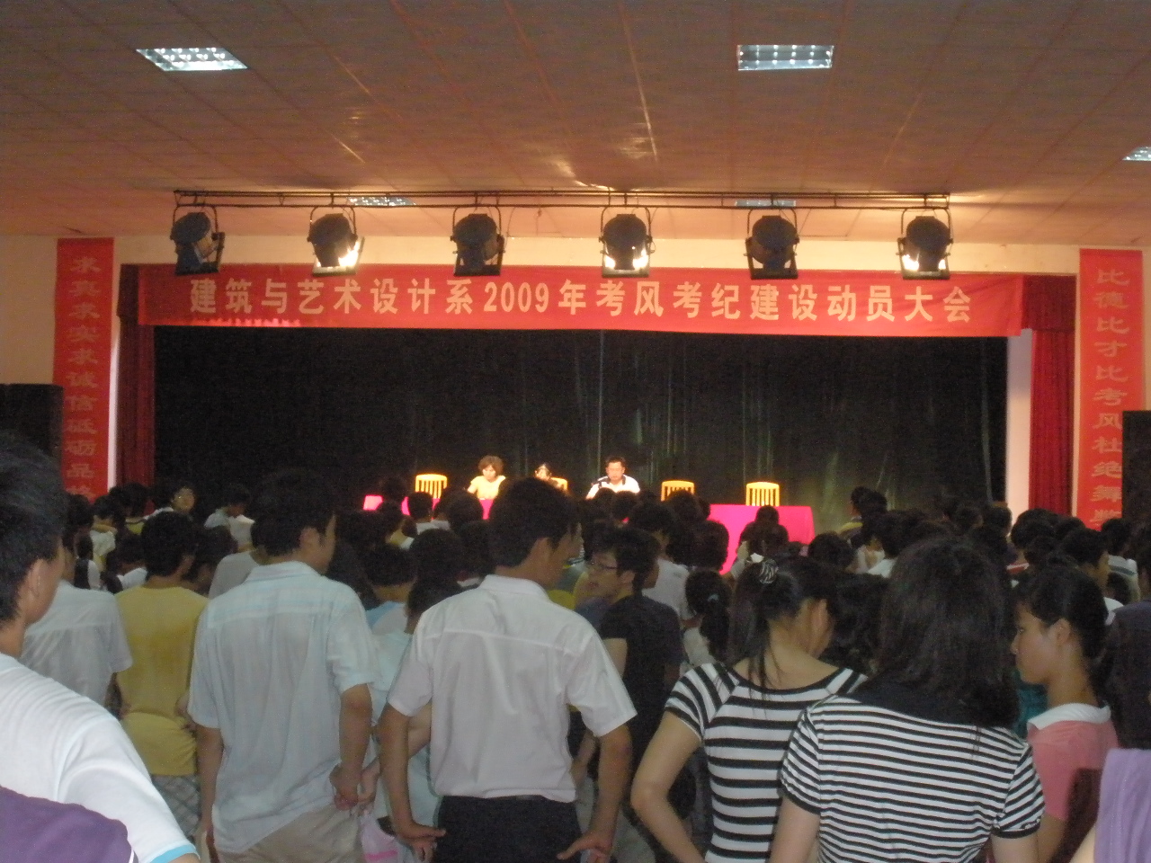 大会分四个流程,首先李主任作考风考纪建设动员报告,报告中强调了考场作弊后果的严重性,以及当代大学生的诚信素养问题。其次,由08工大1班学生冯济平代表学生上台进行诚信考试宣誓,表明了我系全体学生诚信考试的决心。随后各班班长递交诚信考试承诺书。紧接着,夏主任以问题的形式生动形象的概括了本次大会的宗旨,她的发言字字中肯,意味深长将大会的的气氛带入了高潮。最后,由曾主任总结此次大会的重要性,并寄予大家深切的希望。望大家在考场上本着诚信是原则考出自己的水平,交上一份满意的答卷。
