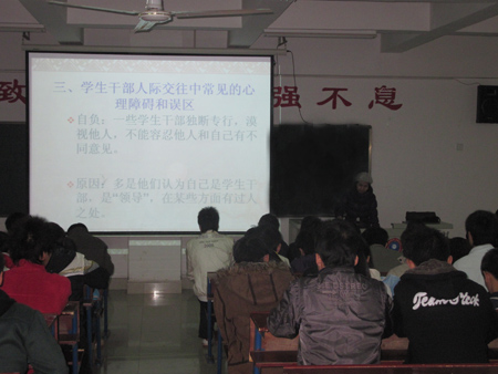 2009年11月15日,我系首届团学干部培训班在主教楼410教室顺利开班。参与培训班的有08、09级各班班长、团支书及学生会、团总支干部,大家齐聚一堂,开始了培训的第一堂课。
