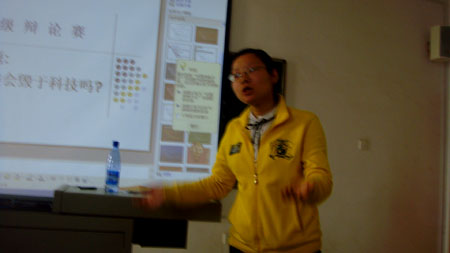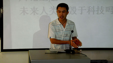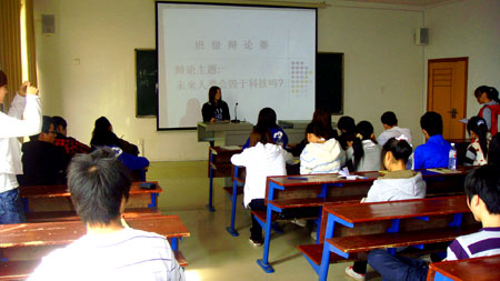 2010年10月19号上午,09艺大班在主教学楼102室开展了一场以“未来人类会不会毁于科技”为观点的辩论赛。