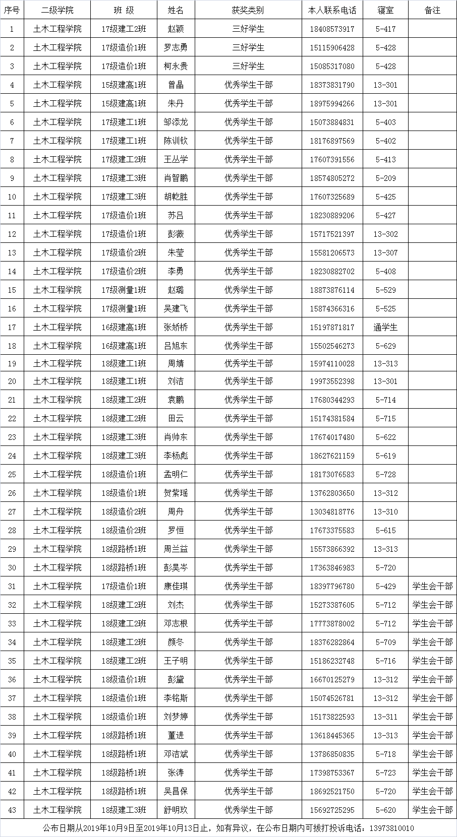 娄底职院 土木工程 学院2018——2019学年度学生评优名单