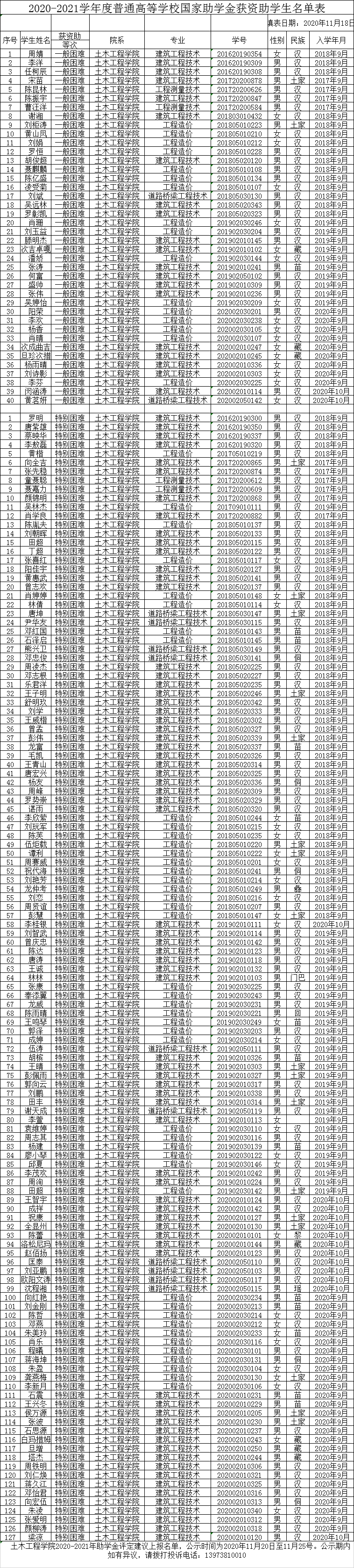 土木工程学院2020-2021学年度国家助学金上报建议名单