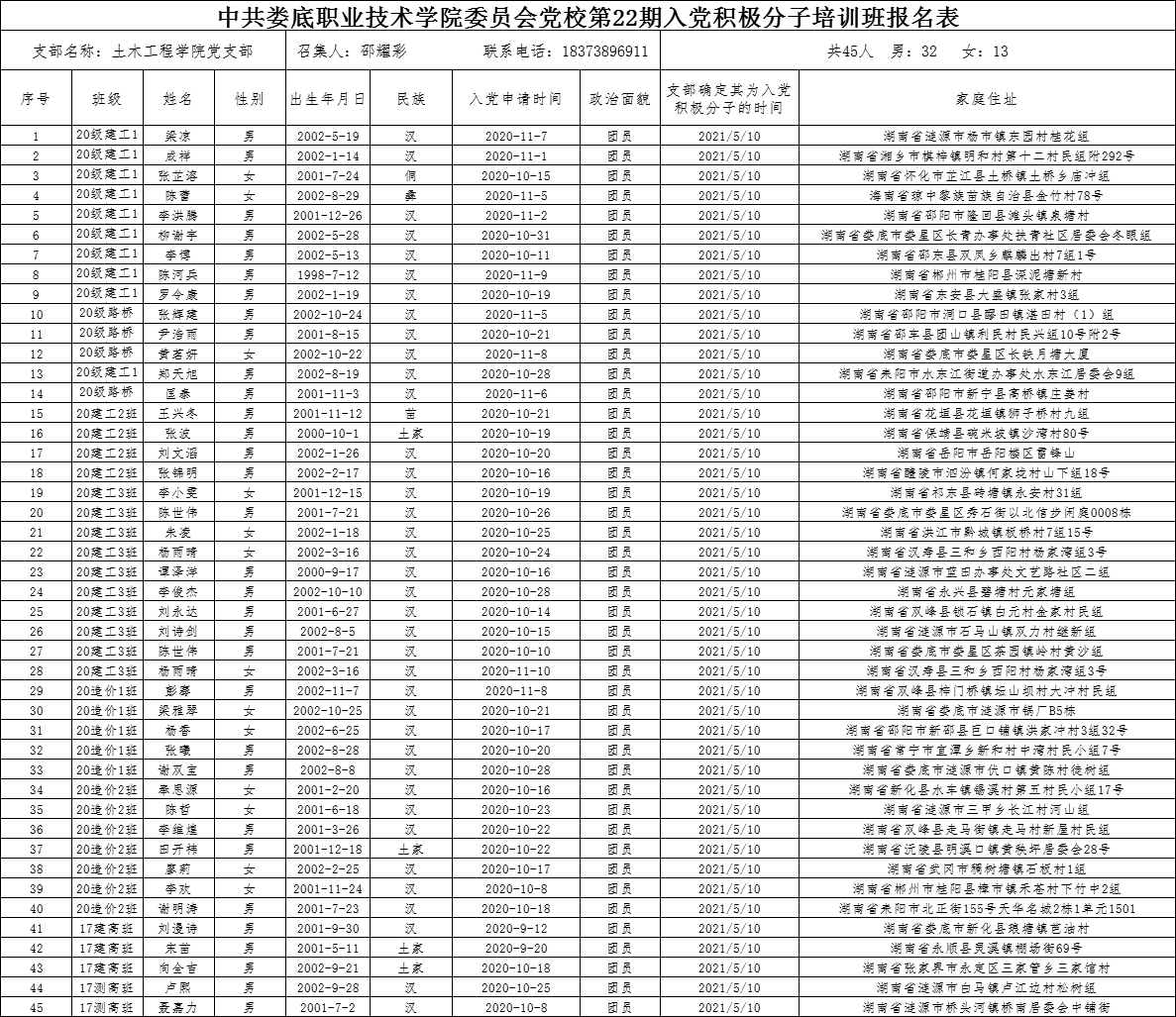 经过班级推荐,现有以下同学拟定为2021年上半年入党积极分子,特公示如下,公示时间为4月30日至5月9日。公示期间内,如有异议,请反映至土木工程学院办公室,电话:13387383232,土木工程学院学生党支部:15073831802