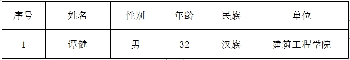 经建筑工程学院教师支部委员会提名,拟吸收谭健1名同志为中共预备党员。根据中共娄底职业技术学院组织部《关于在发展党员工作中建立公示制度的意见》,现予以公示: