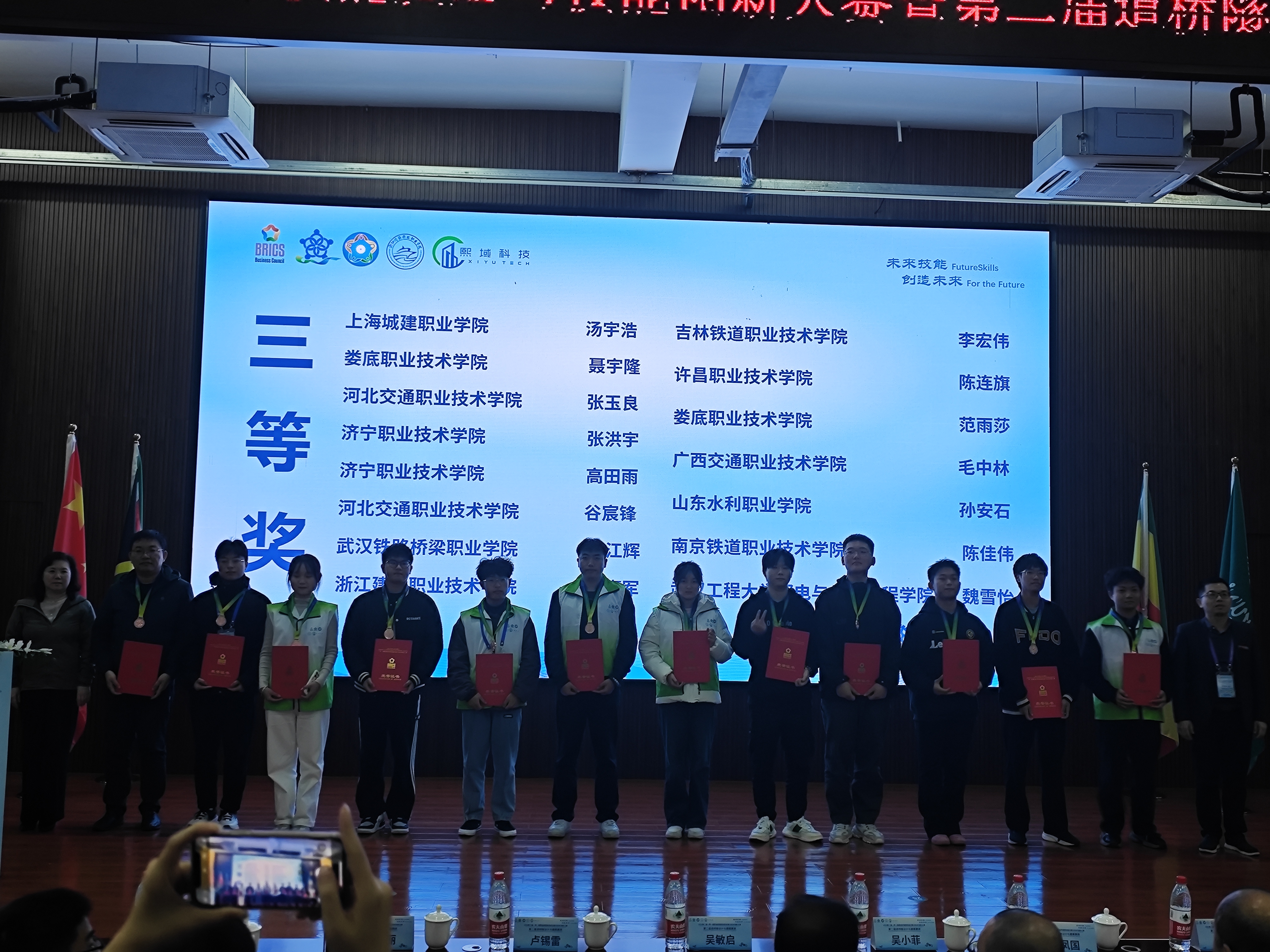 在这场由金砖国家工商理事会中方理事会、一带一路暨金砖国家技能发展国际联盟、中国科协一带一路暨金砖国家技能发展与技术创新培训中心主办,中国发明协会、教育部中外人文交流中心联合主办的高规格职业技能竞赛中,我院参赛团队与来自全国各地的众多职业院校代表队同台竞技。展现了我院在道桥遂设计与建模领域的专业实力和技能水平。经过激烈的角逐,我院参赛团队在严朝成老师的指导下,甘元冬、王彪荣获二等奖(银奖)两项,聂宇隆、范雨莎获得三等奖(铜奖)两项,充分展示了我院师生的职业素养和专业能力。