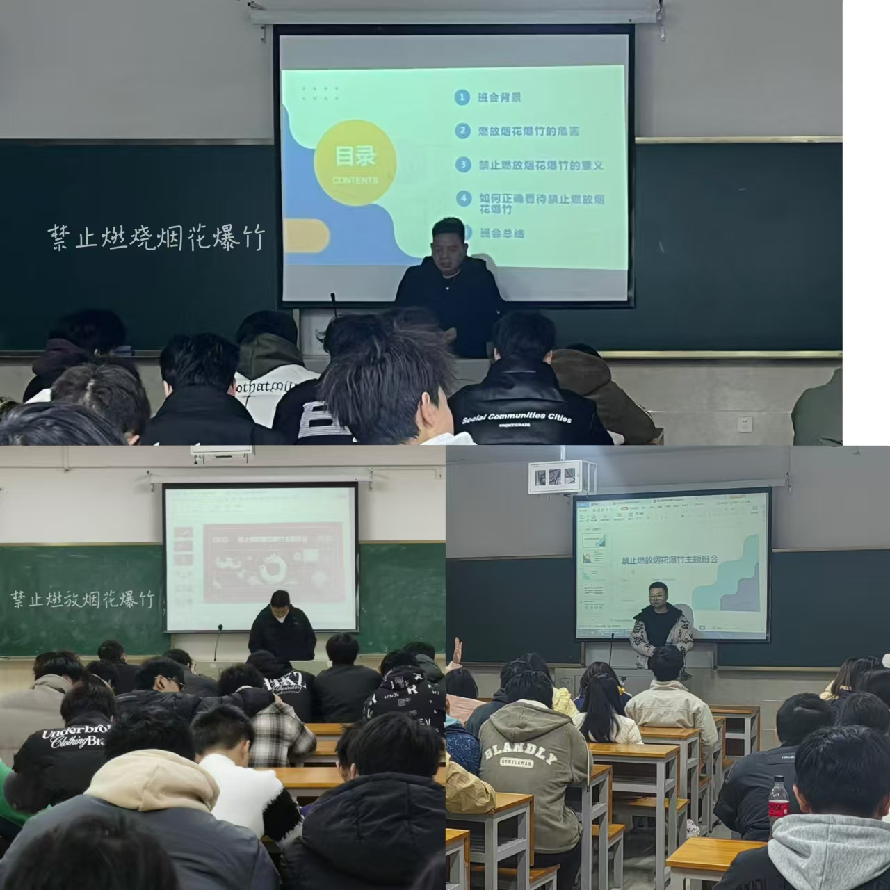为进一步加强同学们的安全意识,培养大学生对安全隐患的察觉,12月22日晚上各班级在主教楼举办了以禁止燃放烟花爆竹为主题的班会,旨在增强同学们的安全意识和环保意识,共同营造安全、文明、绿色的节日氛围。