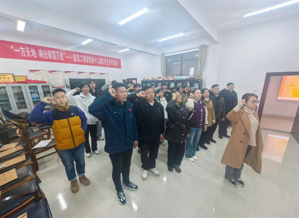 1月8日下午,建筑工程学院于院办党员会议室举行了庄重的预备党员宣誓仪式。此次仪式标志着一批新的先锋力量即将在党的旗帜下,肩负起时代赋予的使命与担当,为学院发展和党的事业注入新活力。参与本次活动的有党总支书记李志强、党支部书记张晶及部分老党员和12名预备党员。此次仪式由学工党支部组织委员邵耀彩主持。