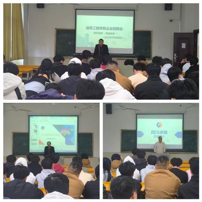 11月14日下午,建筑工程学院联合广州天伦乐公司、四川卓锦建设工程有限公司,在主教楼106教室举办2026届毕业生专场招聘会。本次招聘会邀请到广州天伦乐公司总经理、四川卓锦建设工程有限公司人事经理出席;建筑工程学院学工干事邵耀彩、辅导员周辉华、陈家旺及2026届部分毕业生参与,会议由邵耀彩主持。