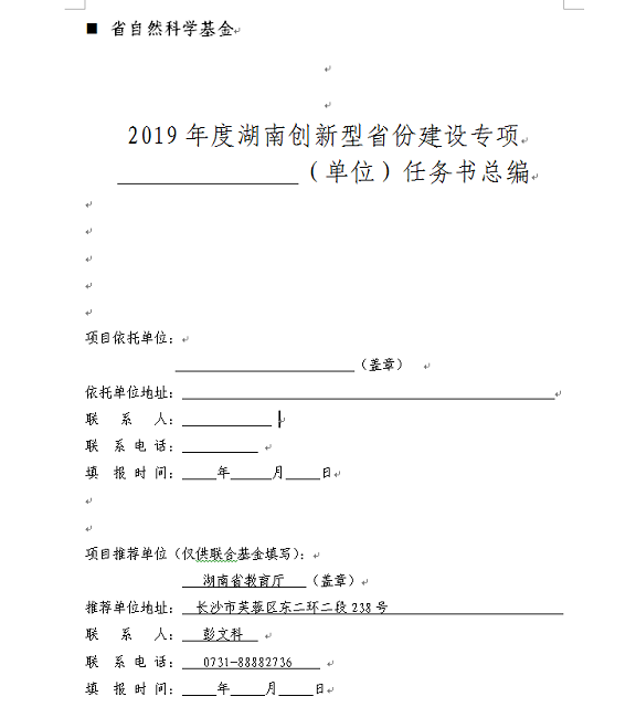 三、各项目负责人、项目依托单位应按《通知》要求准备材料,各项目依托单位于6月21日前将《2019年度湖南省科技创新项目 (单位)任务书总编》和《项目任务书》(一式四份)报送至我厅职成处。