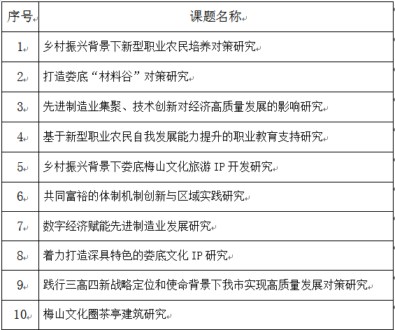 根据《娄底职业技术学院科研项目管理办法》和娄底市社会科学界联合会《关于下达2022年度娄底市哲学社会科学成果评审委员会课题的通知》精神,经申报推荐、形式审查、校外专家匿名评审、评审委员会审定,现对2022年度娄底市哲学社会科学成果评审委员会课题推荐申报予以公示,公示期为2022年3月25日至27日。如有异议,请将有关情况反馈至科技处,或书面意见投入综合楼一楼大厅的公示意见箱内。以单位或部门名义提出异议的,应提供书面材料并加盖本单位或本部门公章;个人提出异议的,应提供书面材料并签署真实姓名和联系方式。匿名或超出期限的异议不予受理。