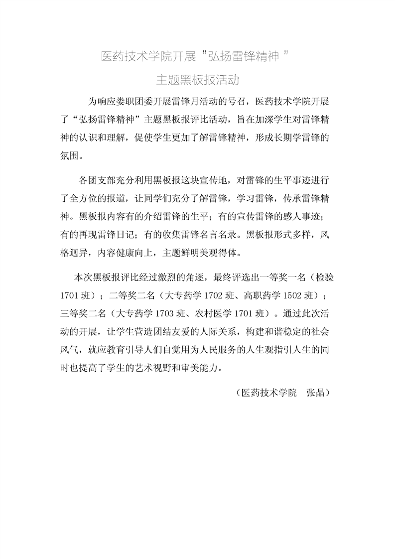 医药技术学院开展“弘扬雷锋精神 ” 主题黑板报活动
