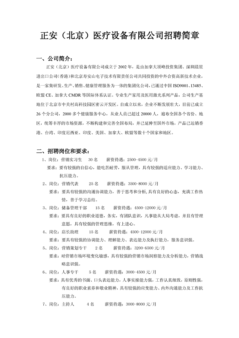 正安(北京)医疗设备有限公司招聘简章