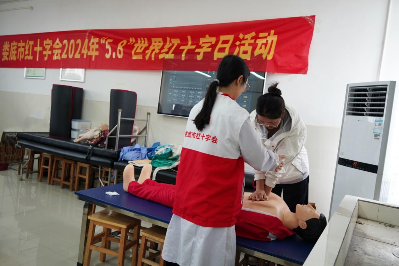 后续,在娄底职院医学部的红十字应急救护智能化培训基地,临床医学院院长谭芳老师带领学校的红十会急救师资团队,给红十字志愿者们进行了心肺复苏、心脏除颤仪使用等一系列应急救护技能的培训。