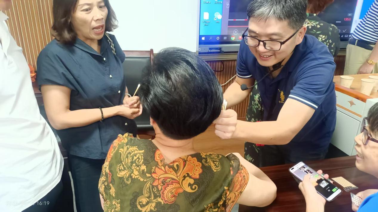 在实践互动环节,志愿者们在老师的指导下,分组为有需求的老年人提供了个性化的耳穴贴压体验服务。他们一对一地进行操作,解答疑问,并根据学员反馈调整贴压位置和力度,确保体验的安全性、舒适性和有效性。老年学员们积极参与,现场气氛温馨而热烈。