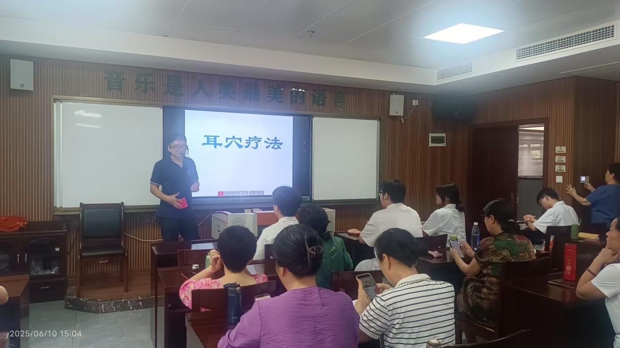 活动现场,吴刚忠首先为老年大学的学员们深入浅出地讲解了耳朵的精细解剖结构,阐述了耳穴与人体脏腑经络的对应关系,并详细介绍了耳穴压豆的中医原理、作用机制及其在常见老年健康问题(如失眠、高血压、关节疼痛等)中的应用价值。