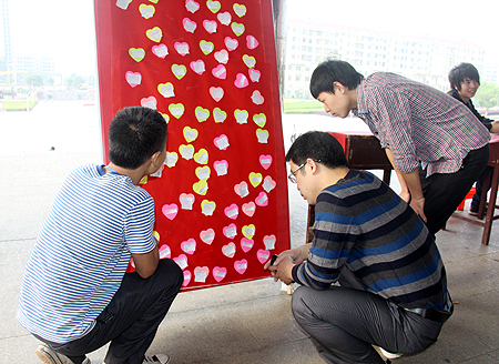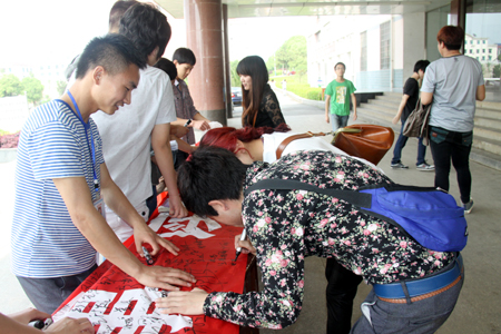7点40分,读者协会会长周丽就带领部分会员在主教学楼门前做好了活动的各项准备工作。随后,院领导郭广军、图书馆馆长李翠兰、图书馆老师黄海平等亲临现场指导。陆续来主教楼上课,或经过主教楼的师生纷纷在 “知人,知理,知事;读人,读理,读书”的横幅上签上了自己的名字,并饶有兴致地来到“知识有奖竞答”题牌前选题回答,凡答对题者都领到了一份小小的奖品。