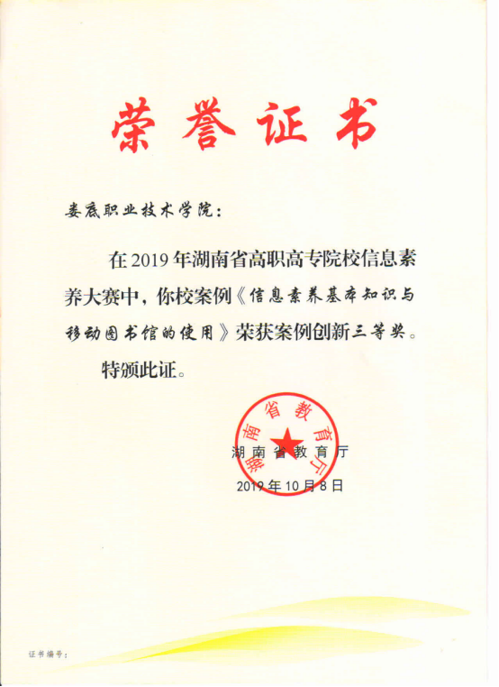 2019年6月,我校图书馆组织馆员和学生参加了湖南省教育厅主办的高职院校信息素养大赛,师生们均取得优异成绩,其中梁亮理老师的《专业信息检索与应用》获得教师组说课一等奖、张理科副馆长执笔的《信息素养基本知识与移动图书馆的使用》获得案例组三等奖、张理科副馆长指导的电信学院18软大三班薛恒同学获得学生组优秀奖。