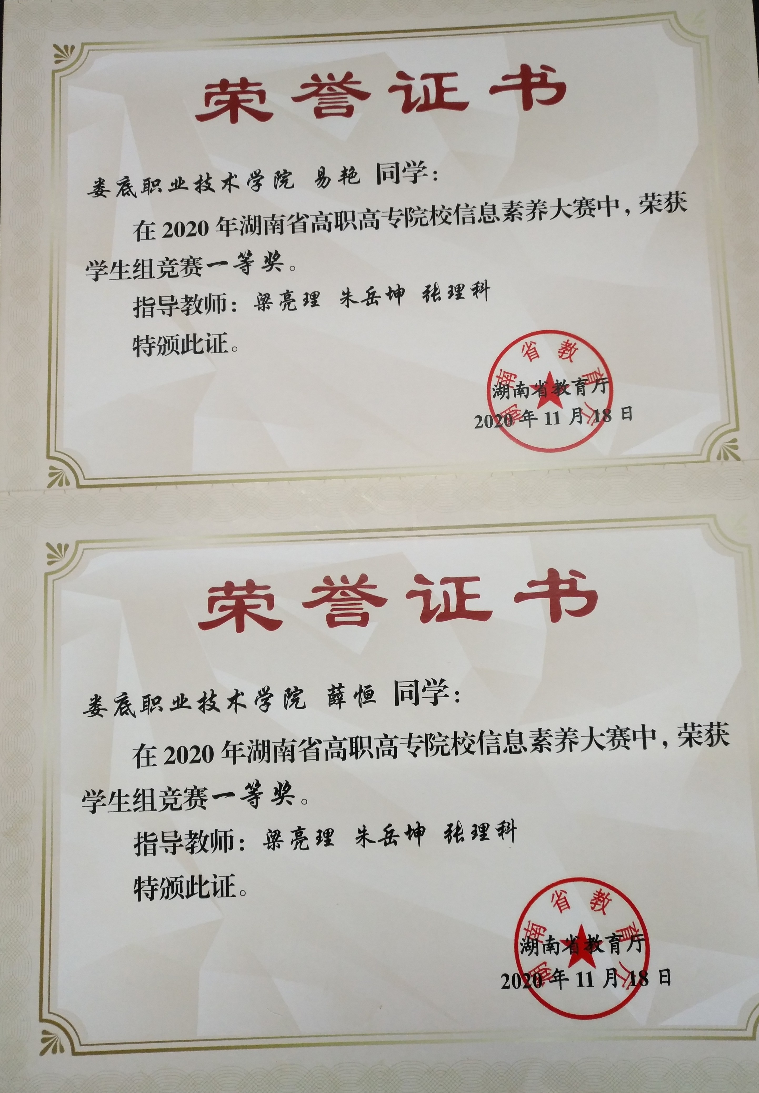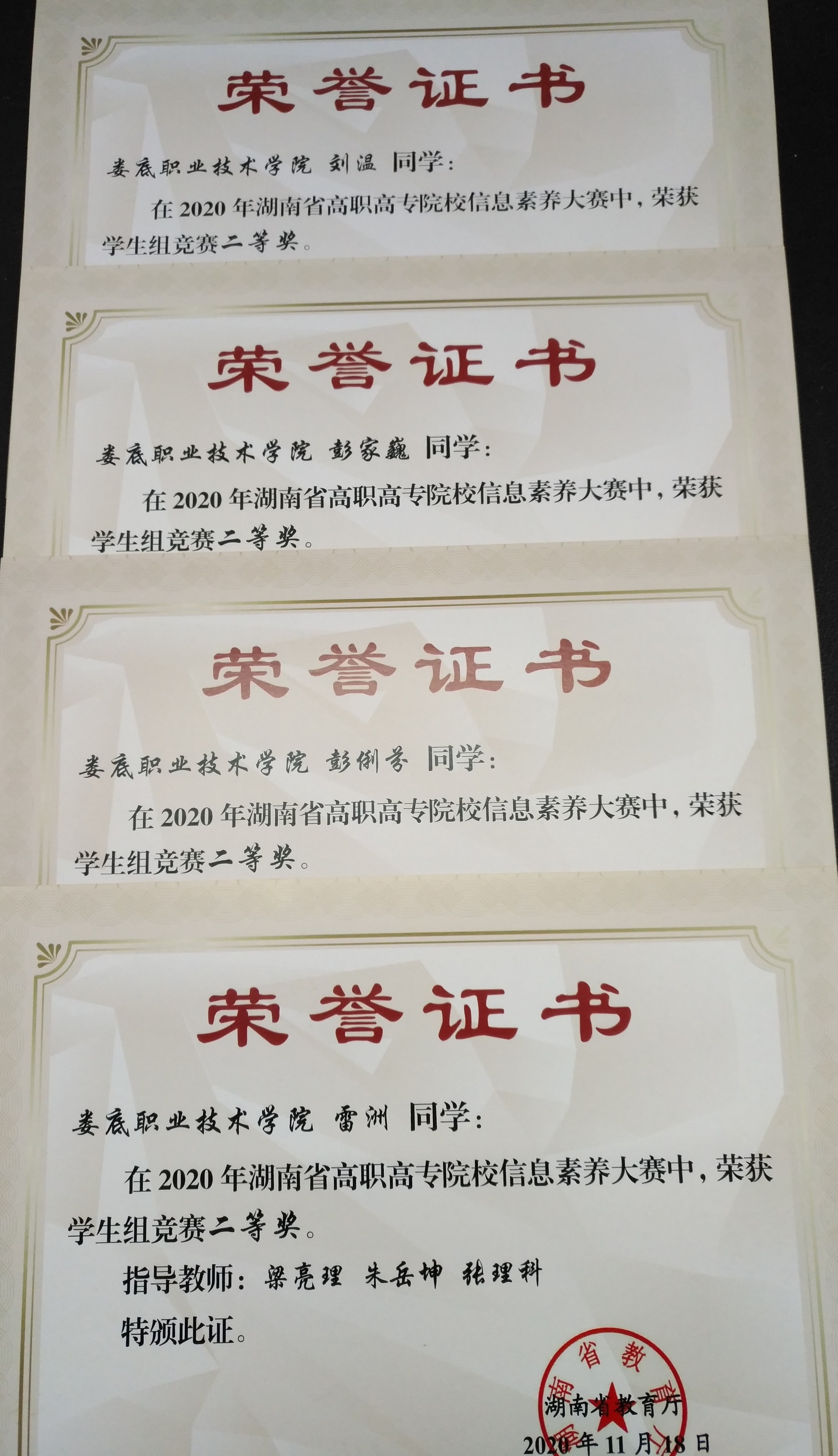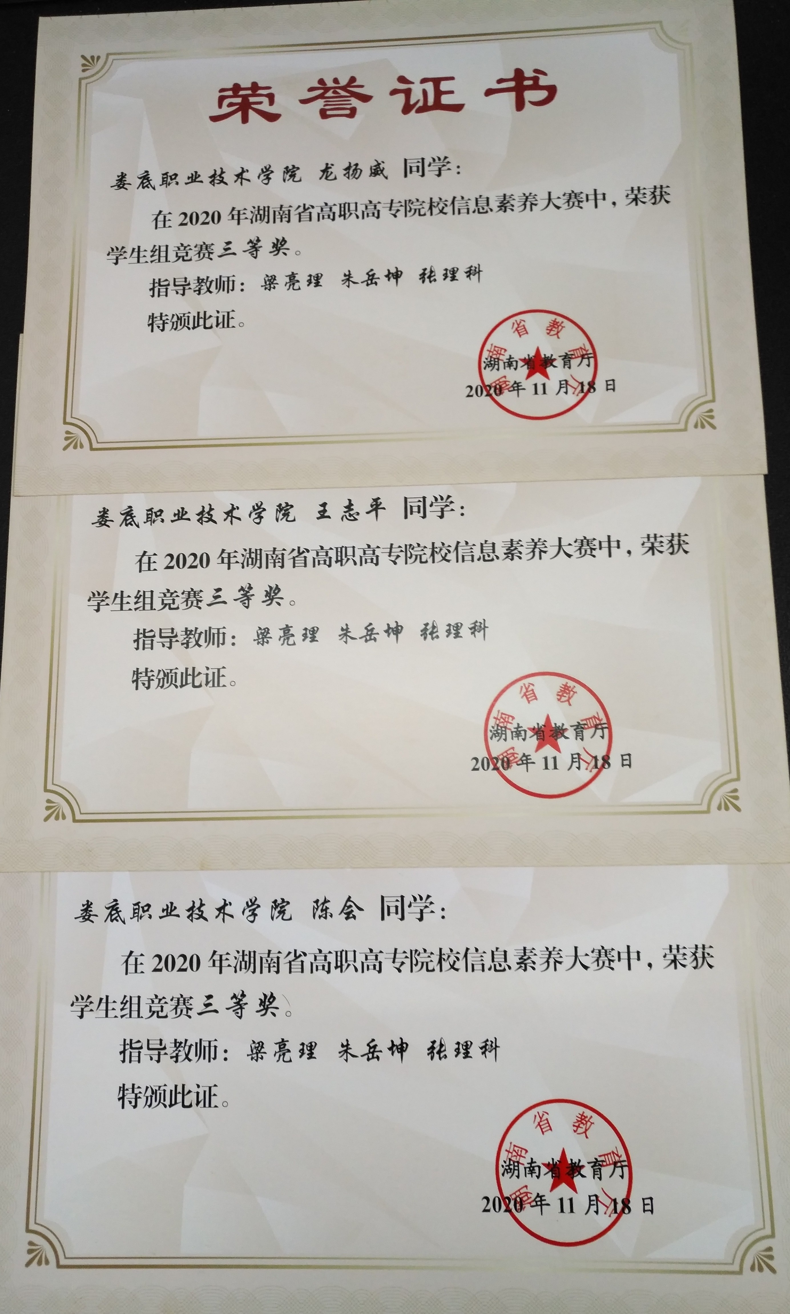 其中娄底职业技术学院获得团体优秀组织奖;由梁亮理、朱岳坤、张理科指导的电信学院薛恒同学、护理学院易艳同学在学生组比赛中获得一等奖,电信学院雷洲同学、电信学院彭家巍同学、会计学院彭俐芬同学、电信学院刘温同学在学生组比赛中获得二等奖,电信学院龙扬威同学、会计学院王志平同学、会计学院陈会同学获得三等奖;梁亮理老师在教师组比赛中获得三等奖。