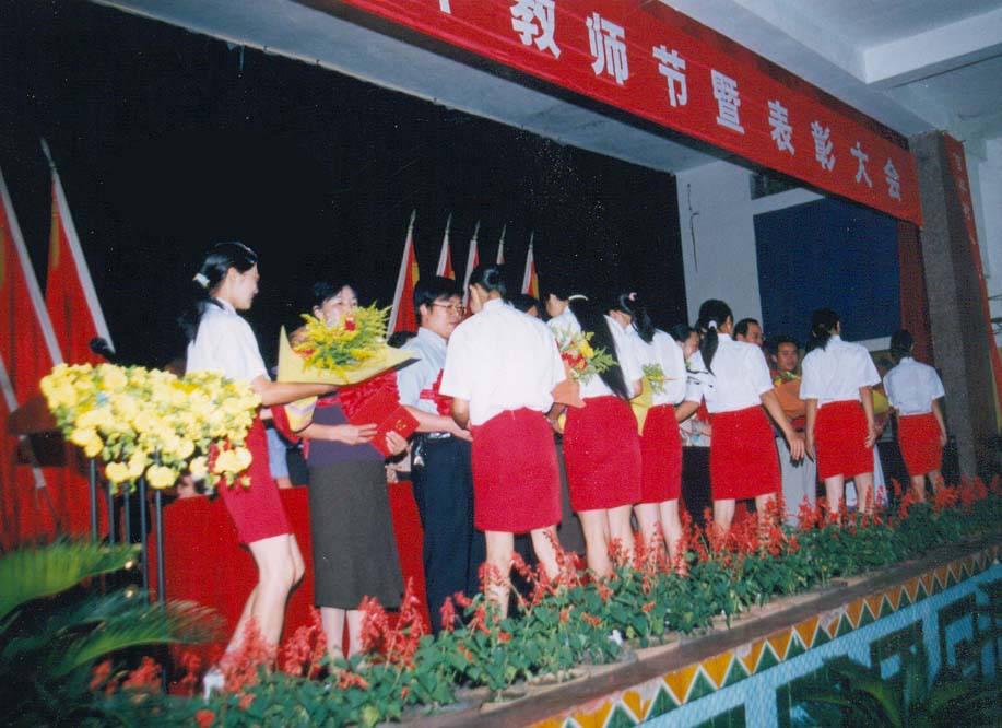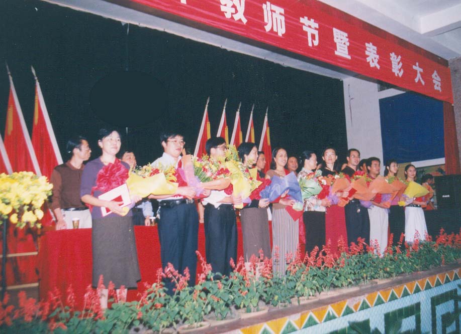 院党委副书记彭建胜宣布了我院十名优秀教师和优秀教育工作者及一名市级优秀教师的名单,在全场热烈的掌声中他们登上主席台,接受了荣誉证书和学生们献出的鲜花。