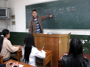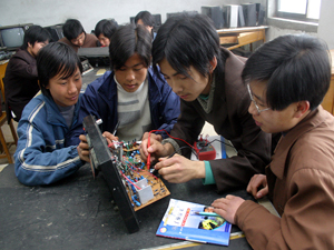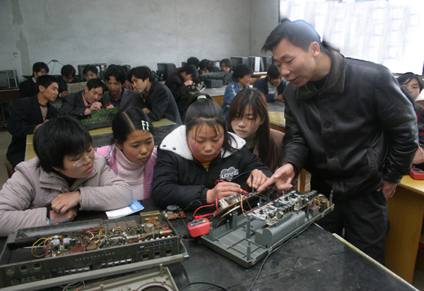 学电子技术的农民学生在实际操作 | 学电子技术的农民学生在实际操作 | 学酒店管理的农民学生在学粤语 |