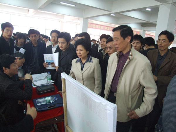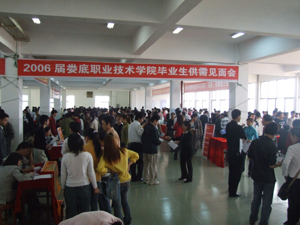 娄底市副市长肖新桃、市委副秘书长梁克和及市教育局、区人事局、区劳动局的领导亲临招聘会现场指导。在党委书记胡卫平等院领导的陪同下,肖新桃兴致勃勃地观看了本次招聘会的展台,并与招聘人员亲切交谈,她说:“这次招聘会很好,影响很大,学校应多想办法为毕业生寻求就业途径,为毕业生办实事,办好事。”并不时提醒企业不要歧视女性。我院1000多名应届毕业生参加了此次招聘会,湖南人文科技学院、潇湘职院的毕业生也慕名前来参加招聘。招聘会现场人流如潮,供需情况十分火爆。其中会计、计算机、英语、市场营销、酒店餐饮、企业管理、机械模具等行业的岗位需要的人数多,应聘的人数也多。学院会计专业大三的陶静对记者说,她已于去年考取了助理会计师,并在娄底的几家企业实习过,她对自己这次应聘成功充满信心。一些企业除了写明入职要求外,对员工的待遇也写得清楚明白,创伟力国际集团在招聘广告上把职工的基本工资、各种保险、加班待遇、住房公积金等项目一一列出,吸引了不少求职者。湖南三一集团打出自己用人的宗旨:    “先做人,后做事,品质改变世界”。一些企业表示:市场是海,企业是船,人才是帆,只有选好了人才,用好了人才,才能确保企业在市场竞争中立于不败之地。