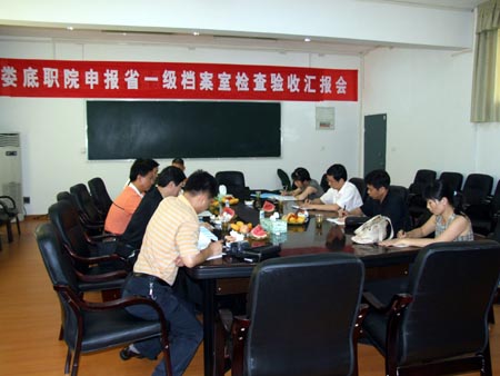 6月29日,我院申报省一级档案室检查验收汇报会在实训楼举行。受湖南省档案局委托,以市档案局局长袁洪清、副局长贺志、省级评估员刘胜初、田莉莹等一行六人组成的档案工作规范化管理省一级评估组来到我院实地检查工作。院党委副书记彭建胜、党政办公室主任刘自斌等参加汇报会。刘自斌向评估组汇报了我院档案工作的相关做法,专家组实地考察了学院教学设施和档案馆的设施及管理工作。