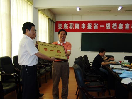 袁洪清用20个字概括了我院档案工作的成果,即“领导重视、设备完善、基础扎实、制度健全、变化很大”。刘胜初代表评估组发表反馈意见,意见指出我院档案工作管理规范,机构制度健全,经费投入到位,库房设备完善,业务管理符合要求,检索条件完备,准确率达到98%,档案的归位、分类、整理均达到了省一级标准。田莉莹宣读了娄底职院档案工作规范化管理省一级评估认定书。袁洪清代表评估组向党委副书记彭建胜授予了省一级档案室荣誉牌。彭建胜在讲话中向省市档案局对我院档案管理工作的指导和支持表示感谢,并指出我院将继续加强全院教职员工的档案意识,充分开发利用学院档案资源,促进档案管理设施的进一步优化。(刘艳)
