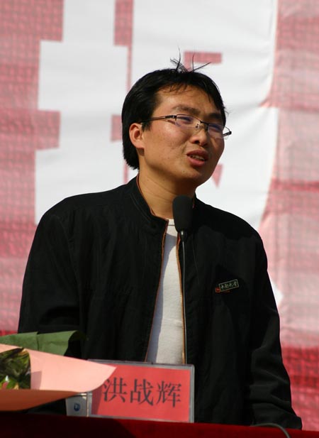 洪战辉于2003年考上怀化学院读大专,今年7月以优异成绩考上了中南大学工商管理专业的本硕连读。他先后被评为“湖南省优秀大学生”、“湖南省首届大学生品学奖”获得者、全国自立自强优秀大学生、2005年“感动中国”十大人物之一。与他同时到来的中南大学学生工作部长喻跃龙教授对学院高度重视并精心安排此次报告会表示感谢,他说,中南大学党委对洪战辉同学作了一个精辟的评价:是广大青年学子中的一颗优秀种子,经世致用、百折不挠、知行合一、敢为人先的湖湘文化和中原文化的深厚土壤以及兼容并蓄、与时俱进的湖南高等教育的光合作用共同培养和磨砺了洪战辉的优秀品质和坚强意志,使他历经风雨,茁壮成长。他带给人们的宝贵精神财富是身处逆境、坚忍不拔的顽强毅力;自立自尊、自强不息的崇高精神;永不放弃,永不认输的达观精神;勇于进取、艰苦创业的实践精神和关爱家庭、回报社会的强烈责任感。