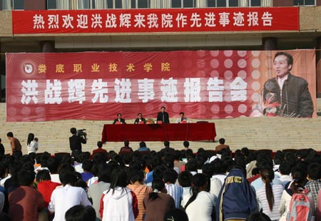 11月3日,2005年“感动中国”十大人物之一的“中国男孩”洪战辉应邀来到娄底职业技术学院,在学院广场为近6000名大专生作了一场精彩的先进事迹报告。学院领导一起聆听了报告,院党委书记胡卫平、中南大学学生工作部长喻跃龙在会上讲话,娄底职院院长刘演林主持报告会。
