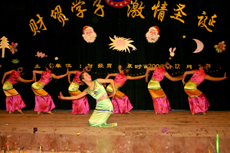一场活泼、热辣的开场舞《向前冲》拉开了整场晚会的序幕。晚会共有10个节目,其中亮点多多,节目中穿插了不少游戏,学工主任张一军上台与同学们一起玩起了高难度的“弯腰过绳”游戏;财贸系学子的必修课“点钞”也被作为一个游戏环节搬上舞台,当一位学生以不逊于点钞机的速度点钞时,全场喝彩声、掌声久久不息,体现了“寓教于乐”的要求。同时,两位可爱的圣诞老人时不时从后台走到观众席抛洒糖果,引得台下阵阵尖叫和欢呼。也为晚会增添了圣诞的气息。
