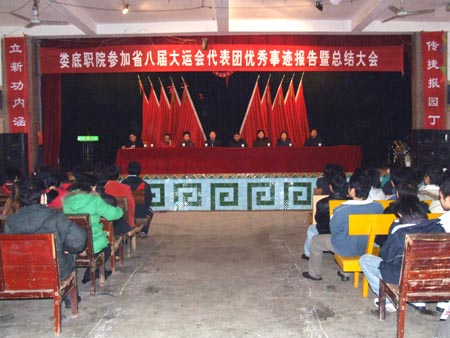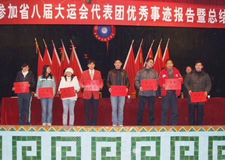 大会由院党委副书记彭建胜主持。院工会主席、第八届省大运会我院代表团领队朱建国向大会作了情况汇报。湖南省第八届大学生运动会由湖南省教育厅主办,湖南农业大学承办,湖南省体育协会和湖南省高教学会协办的一次全省大学生的盛会,于2006年9月-11月举行,历时两个多月,共有57所大专院校的大学生选手参加比赛。我院体育代表队参加了其中女子排球、定向越野、田径三个大项的争夺,共获得5枚金牌、5枚银牌、4枚铜牌,团体总分名列专科院校第五名,被授予优秀体育代表团光荣称号。此外还获得定向越野比赛单项团体总分第一名;女子排球队和田径队分别获得体育道德风尚奖。我院代表团实现了“重在参与、赛出水平、赛出风格、相互学习、增进友谊”的目的。向学院交出了一份比较满意的答卷。